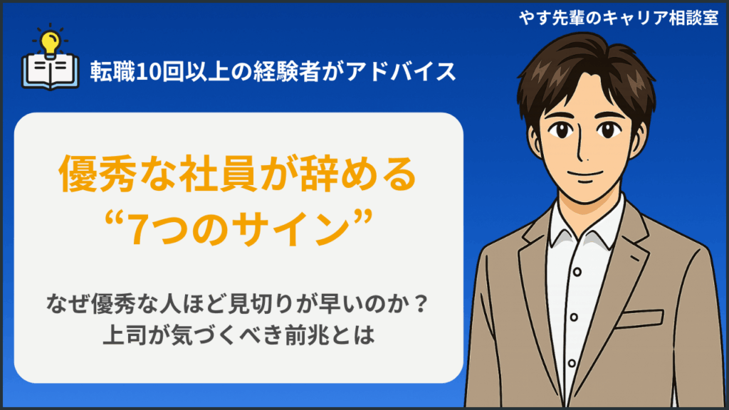 40代半ば、転職10回の管理職。上場もベンチャーもブラックも経験してきました。失敗も学びも交えながら、キャリアや働き方に悩むあなたへ“現実的な解決策”を届けます。⇒詳しいプロフィール 「まさか、あの人が辞めるなんて…」優秀な社員の退職は、チームや... -