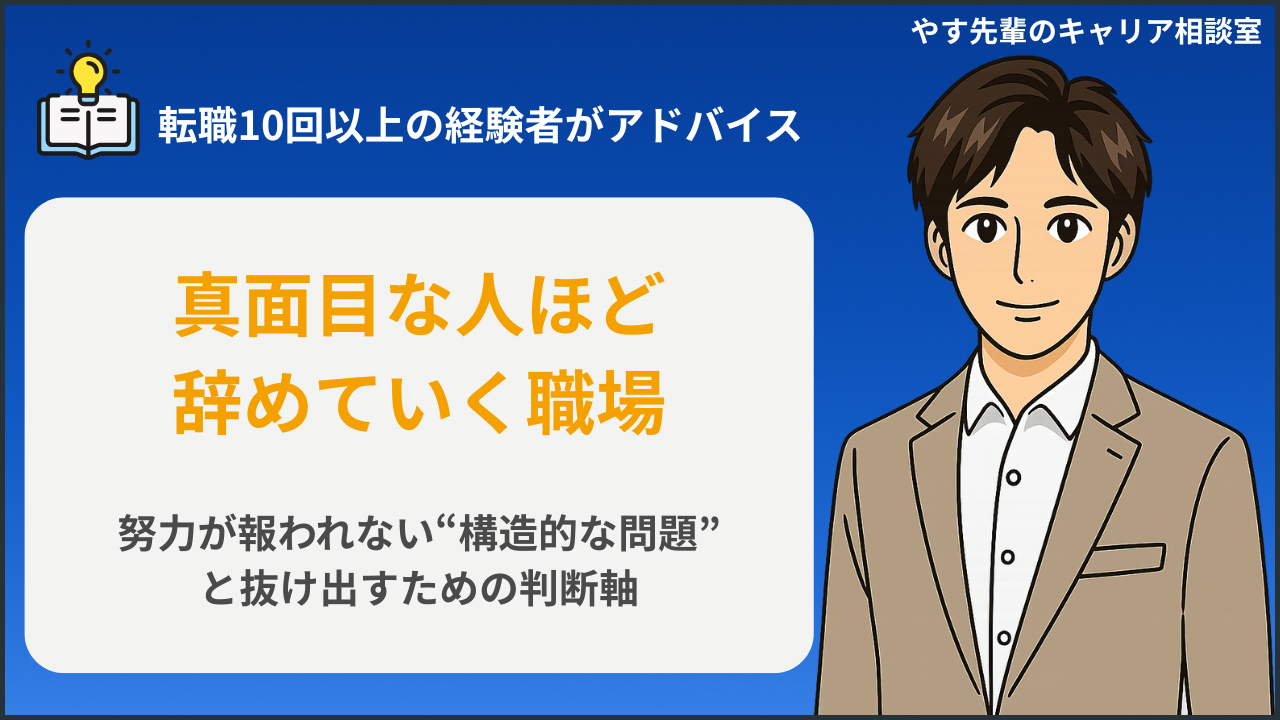 やす先輩40代半ば、転職10回の管理職。上場もベンチャーもブラックも経験してきました。失敗も学びも交えながら、キャリアや働き方に悩むあなたへ“現実的な解決策”を届けます。